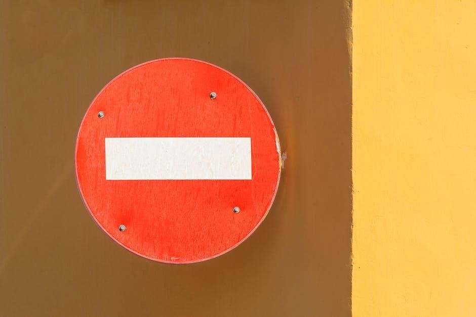 Ignoring a NO ENTRY sign can lead to severe consequences‚ including accidents‚ security breaches‚ or legal penalties. These signs are vital for protecting personnel‚ property‚ and maintaining operational safety. Compliance is non-negotiable‚ ensuring that individuals respect designated boundaries and avoid unauthorized access‚ contributing to a secure environment.